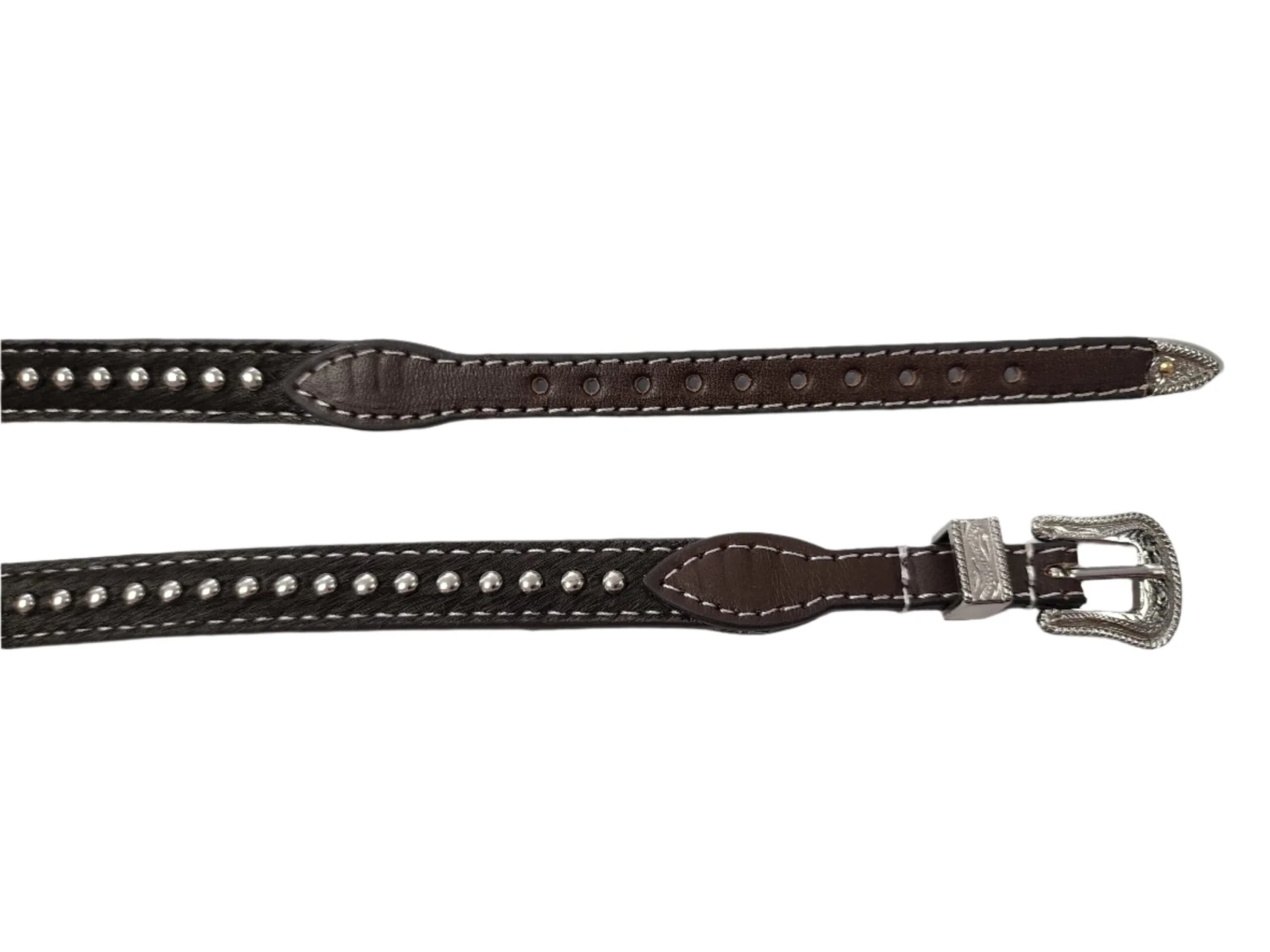 Create your own personalized rugged look with this western style calf hair hatband by M&F Western Products. The round silver beads add a touch of flare that will definitely give you a great look. This hatband uses a belt style adjustment with a rounded silver buckle.