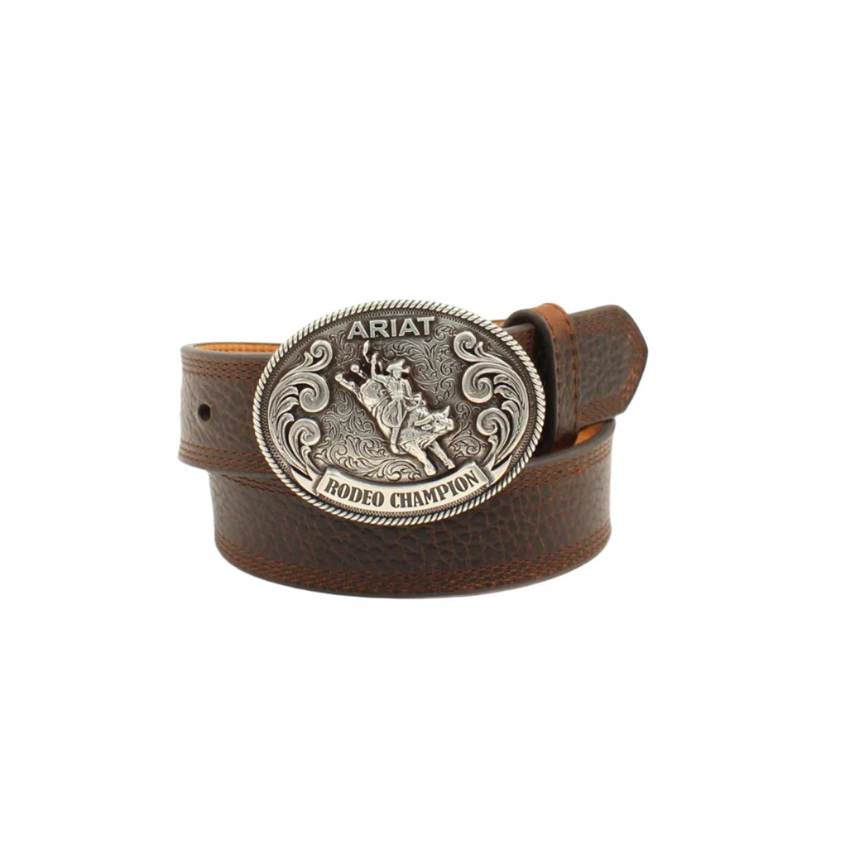 - Silver Ariat Buckle with Rodeo Champion Wording Bullrider Motif on Buckle