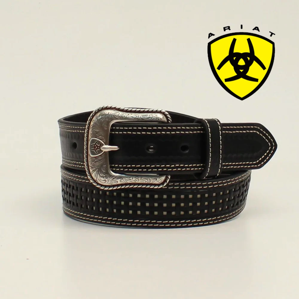 Great looking western Ariat men’s belt by M&F Western Products. The genuine leather strap is black with a basket weave pattern and white underlay. Removable silver Ariat buckle.