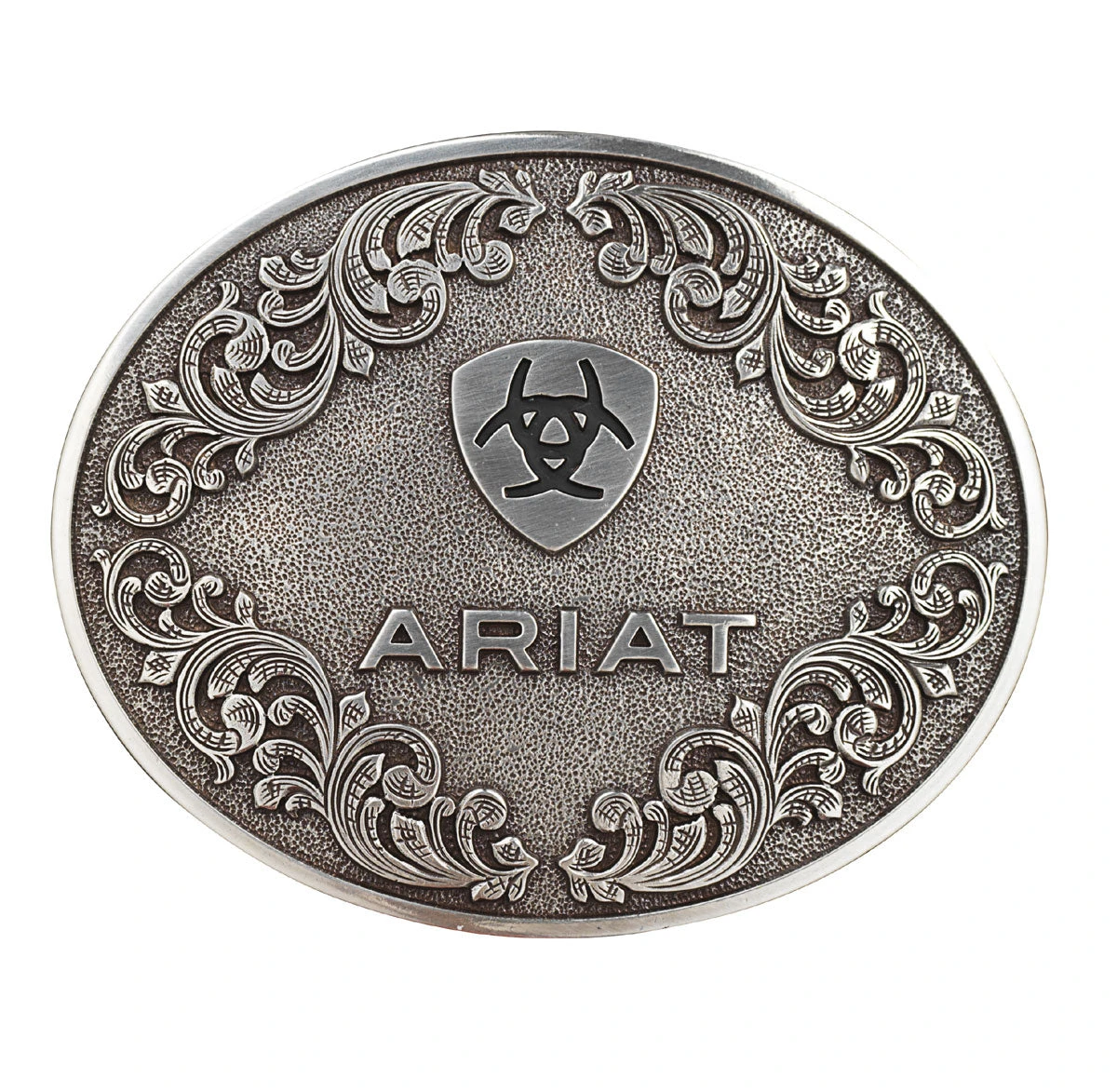 Great Ariat buckle by M&F Western Products. It is an oval buckle with an Ariat shield and logo inthe middle. Buckle comes in an Ariat box.