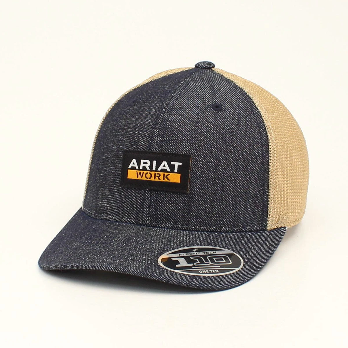 Comfortable Ariat men’s cap by M&F Western Products. Denim front panels and bill with small rectangle patch that reads ARIAT WORK. Tan mesh back panels with snapback closure for a perfect fit.