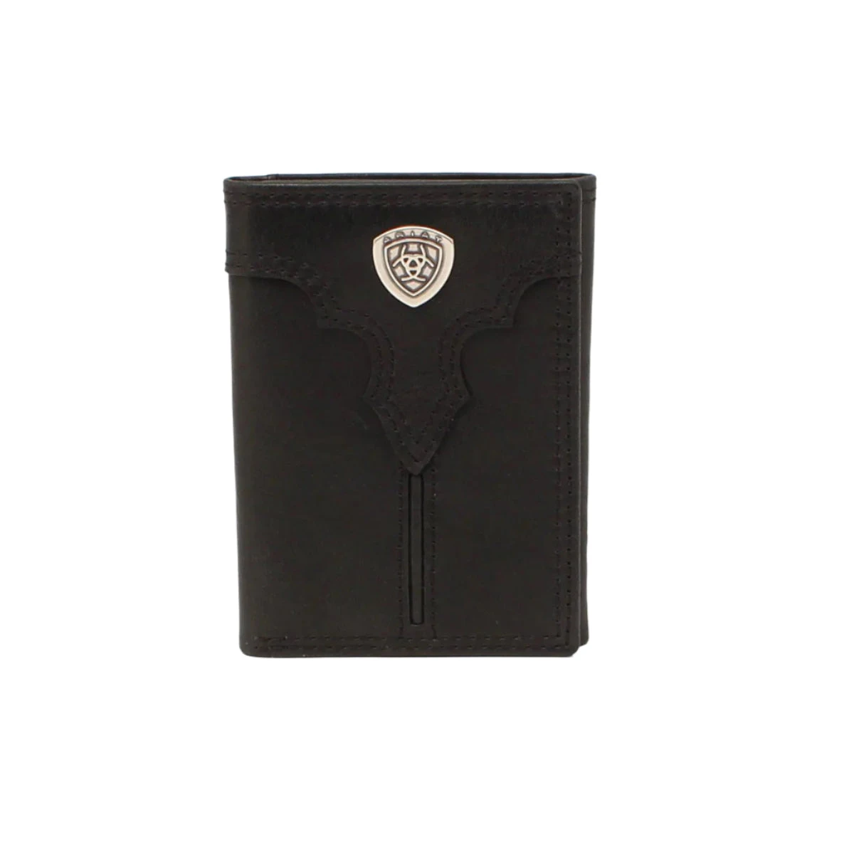 Stay both organized and in style with this Ariat trifold wallet by M&F Western Products. Genuine leather with Ariat shield logo. Features multiple compartments for your credit cards, cash and ID.