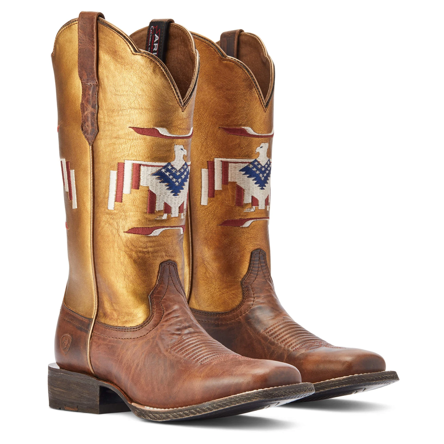 Part of our limited-edition Chimayo collection, this gorgeous boot pays homage to the New Mexican weaving tradition. Featuring a patriotic thunderbird against a shiny gold shaft, it’s built on a comfortable leather sole with an extra layer of heel-to-toe cushioning.