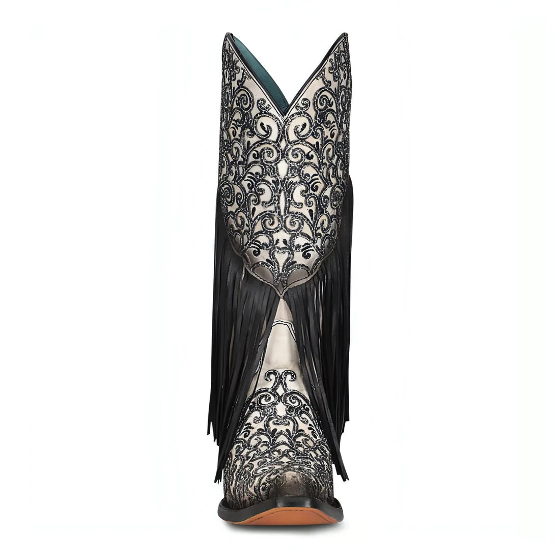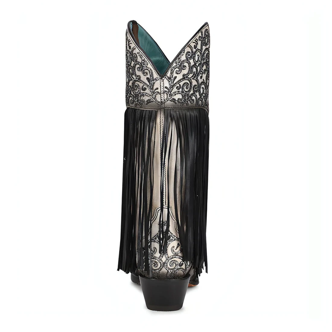 An eye-catching boot with a black fringe and intricate silver stitching will sure make heads turn to admire you and your style.
