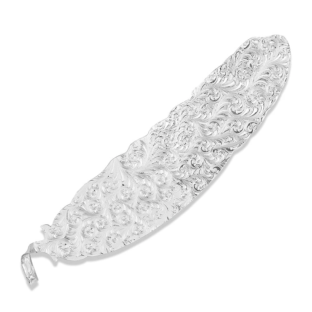 Patriotic pride in our completely innovative Hat Feather! Finished in a bright silver, this feather is engraved to mimic the beauty and irregularity of a natural feather, with sections and little swirls that add character and interest for this piece. This classic hat feather has red, white, and blue stars and strips down the main vane. The trademarked fastening system will secure onto most hat bands.