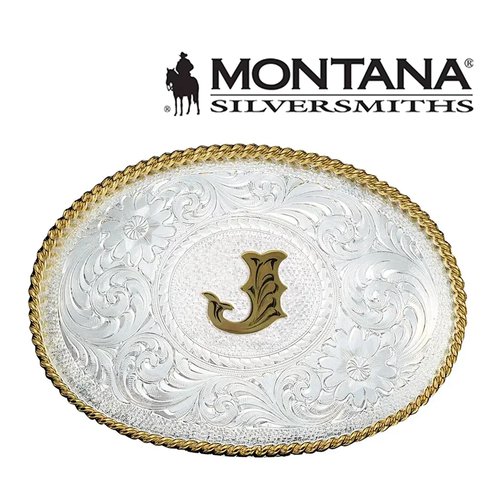 Medium sized silver oval shape belt buckle fully engraved in traditional Western bright cut scrolls. Gold twisted rope trim. Engraved gold letter in western style font (style B3) applied to center stippling. Standard 1.5″ belt swivel. Out of stock products may be special ordered through customer service and generally available in about six weeks.