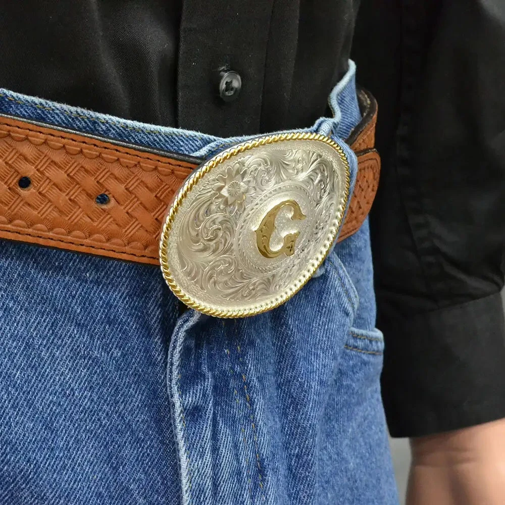 Medium sized silver oval shape belt buckle fully engraved in traditional Western bright cut scrolls. Gold twisted rope trim. Engraved gold letter in western style font (style B3) applied to center stippling. Standard 1.5″ belt swivel. Out of stock products may be special ordered through customer service and generally available in about six weeks.