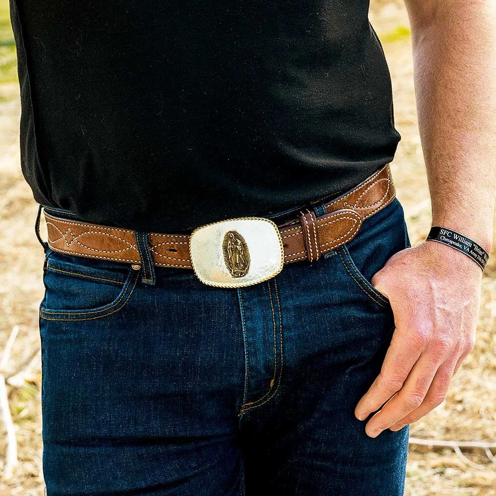Inspired by the natural free flowing texture of rippling water, we love this good ol’ classic belt buckle we call the Lady of Guadalupe Rippling Waters Buckle. It is squared off, yet rounded in shape. It is silver-finished with a soft texture that resembles rippling water on the front. In the center lays a gold-finished figure of Lady Guadelupe. It is framed in a gold-finished rope detail. Standard 1.5 inch belt swivel.
