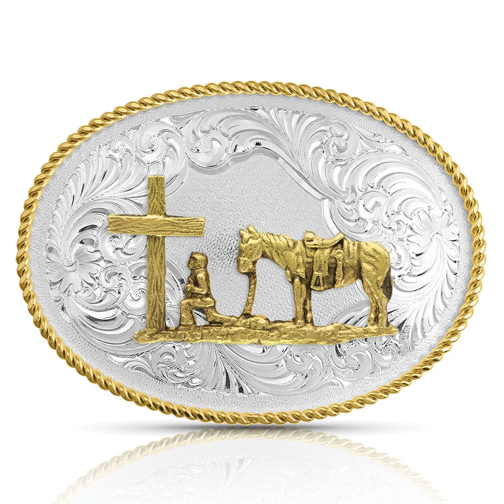 A silver-finished oval belt buckle with gold roping detail for trim. A gold Christian cowboy kneeling before a cross while his horse stands patiently nearby is applied to the center of a stippling background, framed all around with detailed floral filigree engraving and flower accents. Standard 1.5″ belt swivel.