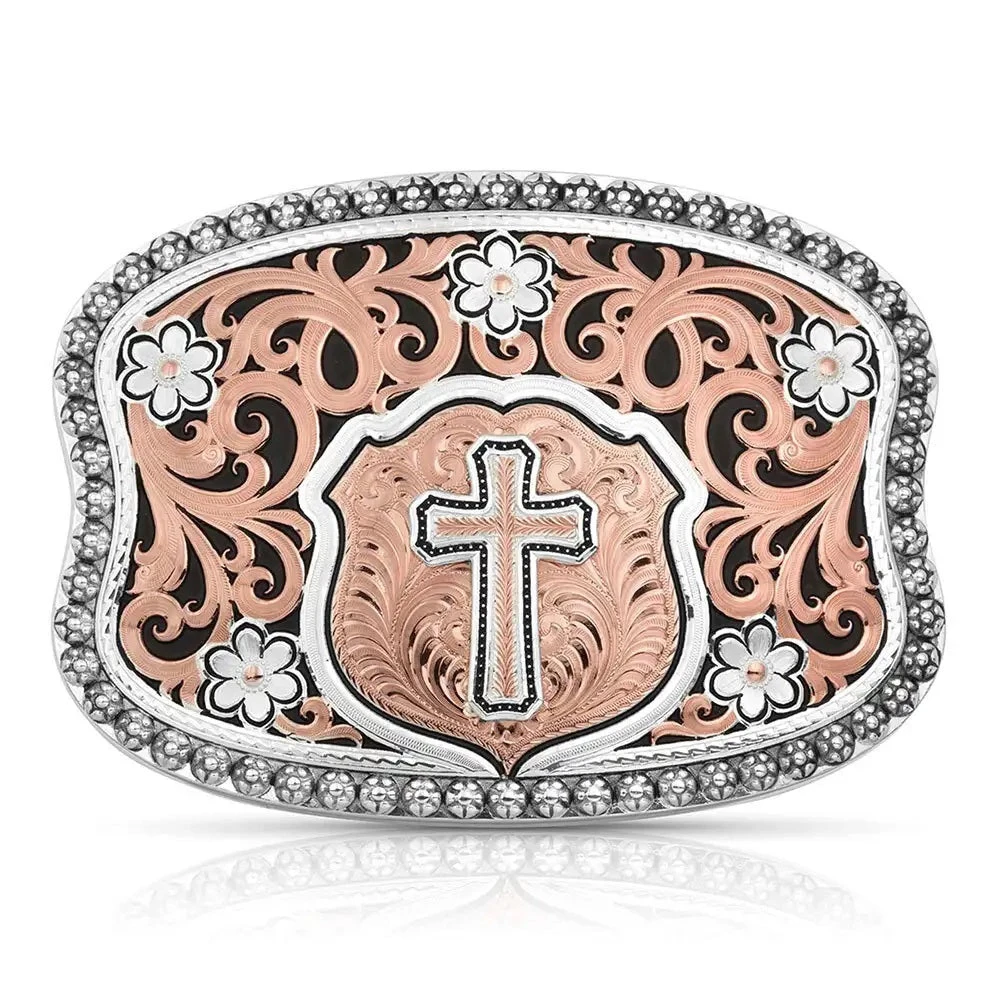 A beautiful two tone buckle with a soft “pinch” to the ends has a lower center rose gold shield with bright-cut engraving with a thin line of black with a thicker line of bright silver finish. A silver and rose gold wheat cross is applied to the center of the shield. Thick lines of rose gold finished filigree swirl and fill the inner area of the buckle dotted with five silver finished flowers interspersed evenly throughout the filigree. The hand-painted black background emphasizes the richness of the rose gold and silver. An inner stitched edge of bright silver finish has an outer edge of lightly antiqued silver finished berries. Standard 1.5 inch belt swivel.