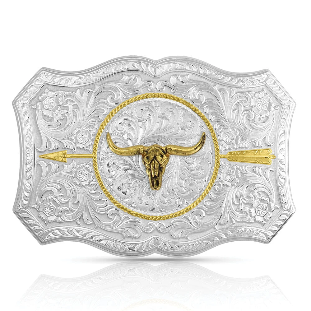 Large, scalloped shape belt buckle with a polished etched feathered trim. Silver finished filigree vines flow and curl surrounding a bright gold cut engraved rope to represent a bow with an arrow stretching through. A gold longhorn skull is placed in the center surrounded by even more silver filigree swirls. Standard 1.5″ belt swivel.