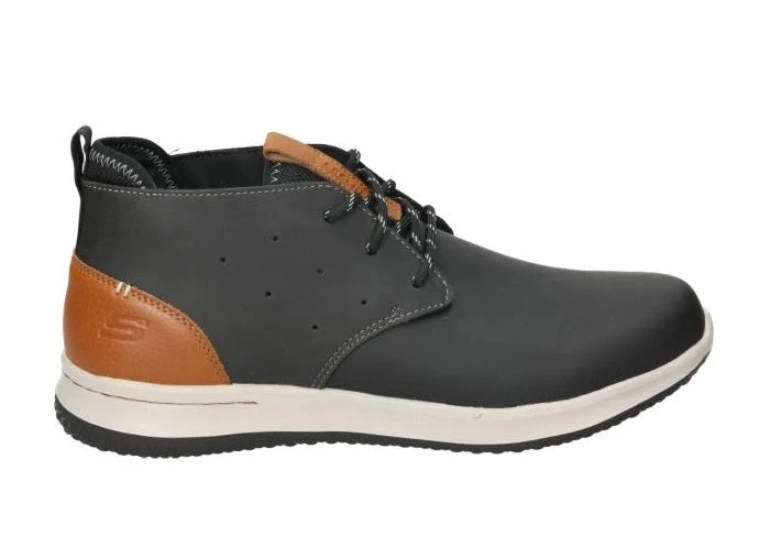 Try something smooth, versatile and very comfortable with the SKECHERS Delson – Clenton shoe. Smooth leather upper in a lace up casual comfort mid top chukka oxford with stitching, perforation and overlay accents. Air Cooled Memory Foam insole, flexible comfort midsole.