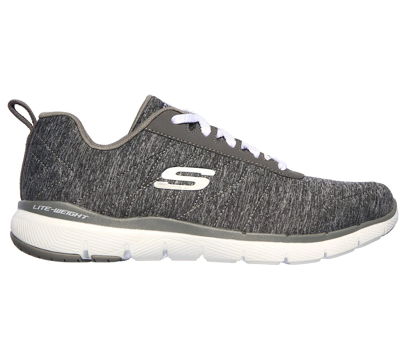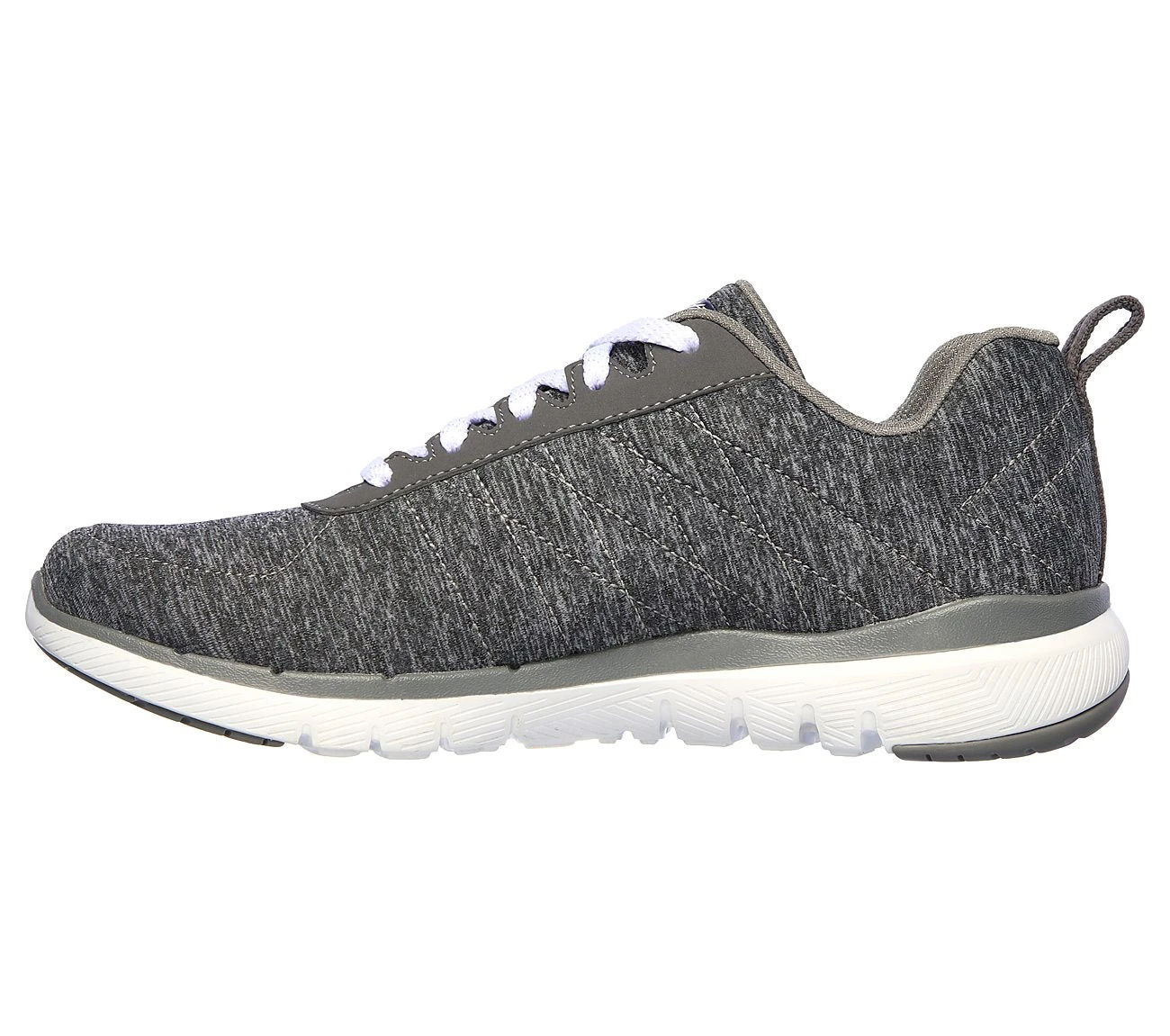 Add some soft responsive comfort and athletic style to your workout with the SKECHERS Flex Appeal 3.0 – Insiders shoe. Soft woven heathered-finish jersey knit fabric upper in a lace up athletic sporty training sneaker with stitching accents and Air Cooled Memory Foam insole.