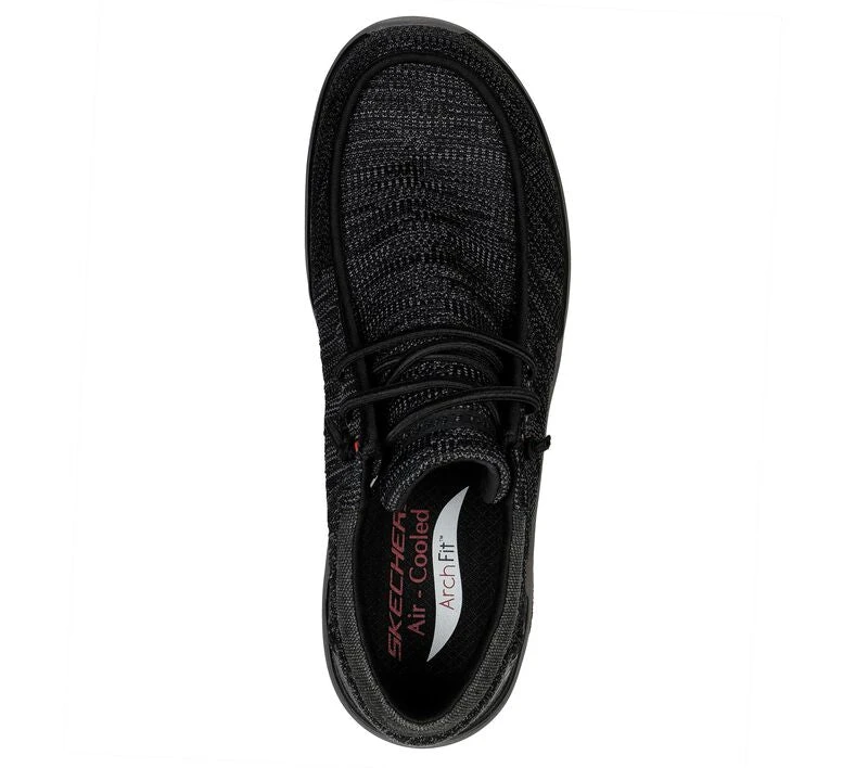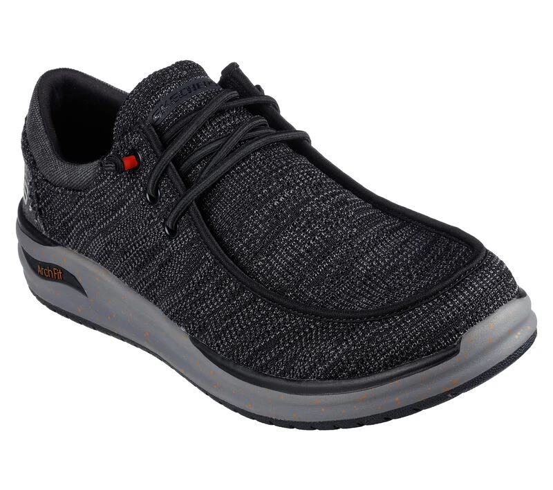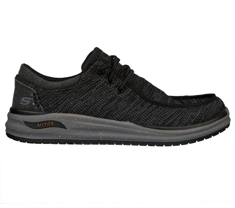 A breathable classic silhouette meets supportive comfort in Skechers Relaxed Fit®: Arch Fit® Melo – Darson. This moc toe style features a heathered knit upper, with knotted stretch laces and piping detail, plus a supportive removable Arch Fit® insole.