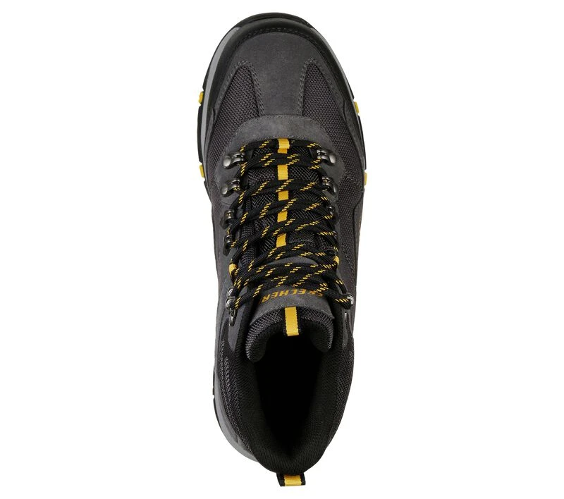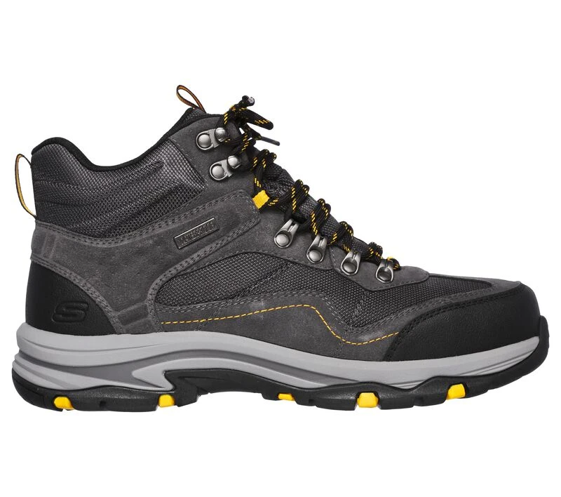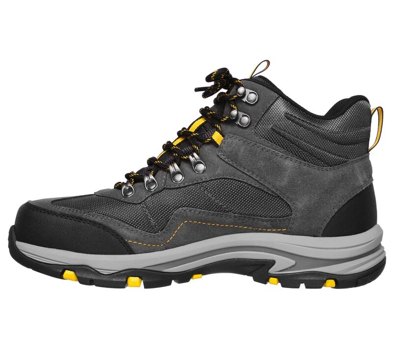 Take on the trails in rugged style and long-lasting comfort wearing Skechers Relaxed Fit®: Trego – Pacifico. This lace-up hiking boot features a waterproof suede, synthetic and mesh upper with cushioned Air-Cooled Memory Foam® insole.