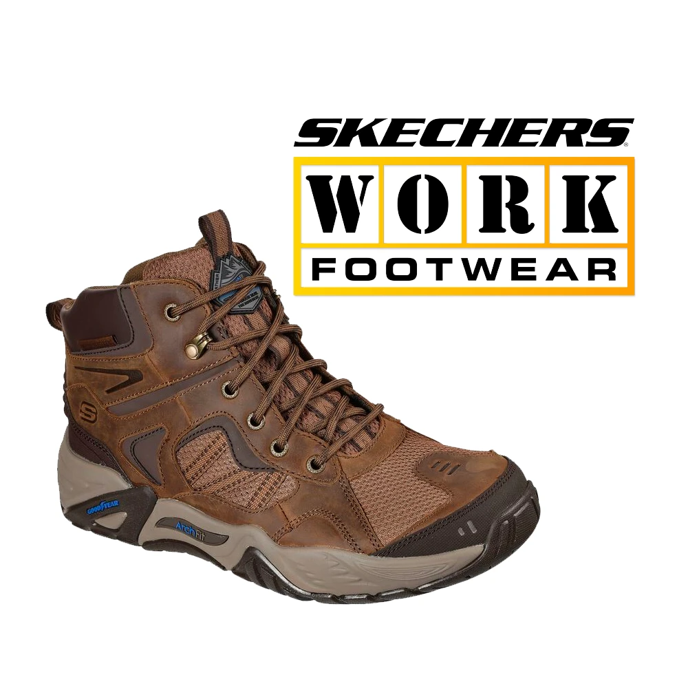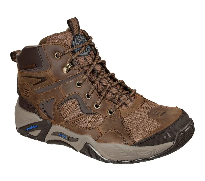 Support and comfort for any quest comes in the Skechers Relaxed Fit®: Arch Fit® Recon – Percival shoe. This mid-top trail shoe features a water repellent leather and mesh fabric upper with a lace-up front, removable Arch Fit® insole and Goodyear® Performance Outsole.