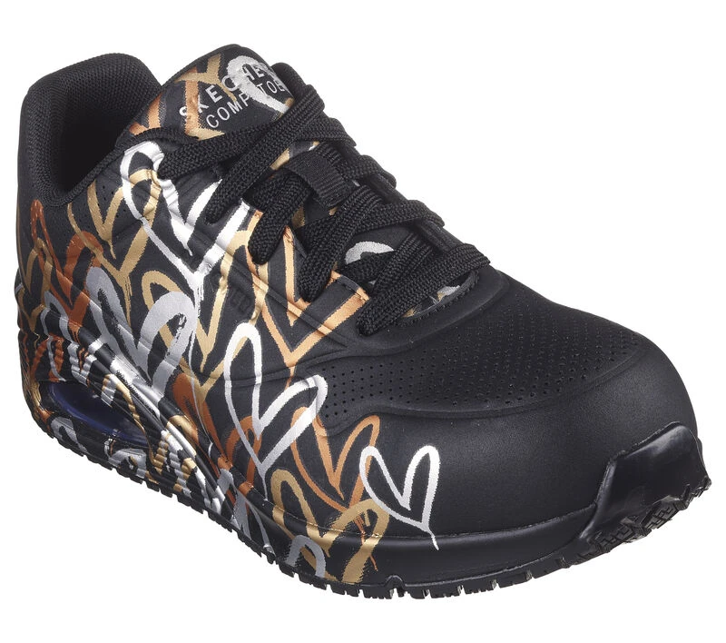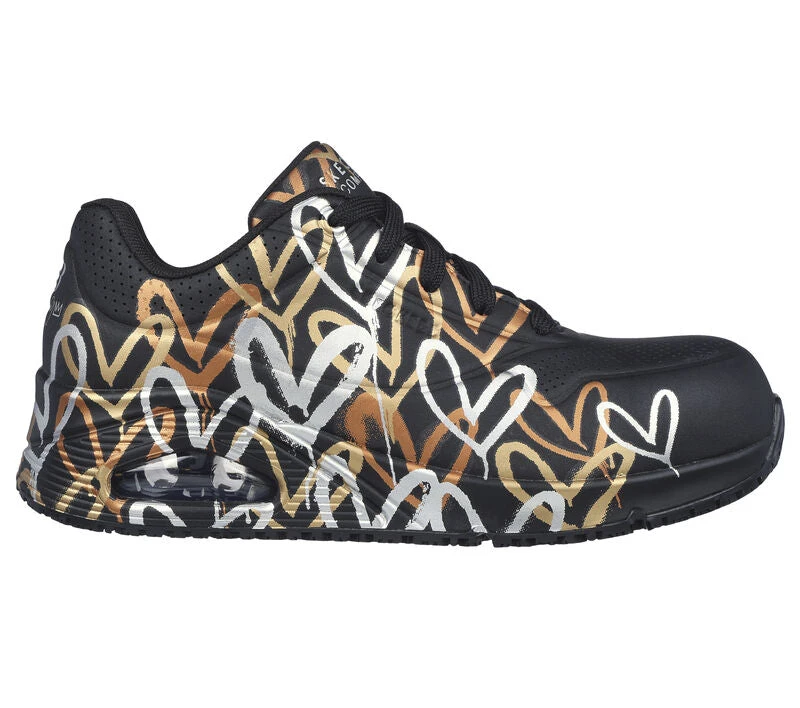 Internationally renowned muralist James Goldcrown brings his iconic #Lovewall heart designs to Skechers in this inspiring collaboration. Get to work in safe and creative style wearing Skechers Workâ„¢ x JGoldcrown: Uno SR. This sporty work lace-up features a print of the artist’s signature heart design on a synthetic duraleather upper with a composite safety toe and a visible Skech-Air® airbag midsole.