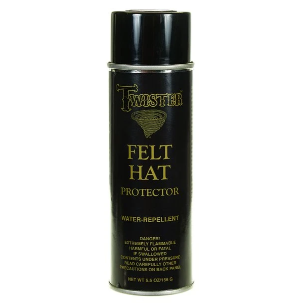 The Twister Felt Hat Rain & Stain Protector is made specifically for use on felt and beaver hats, is guaranteed to keep your hat water-repellent, and can safely be used on all colorfast hats. Comes in a 5.5 oz spray can.